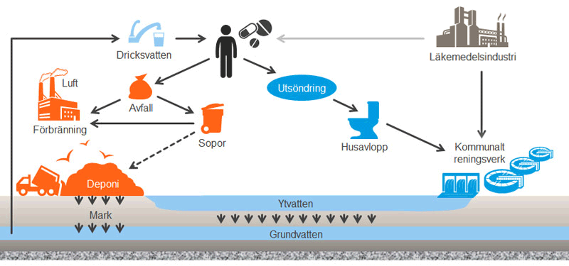 I Sverige uppkommer de absolut största utsläppen av läkemedelsrester i samband med användning. Läkemedel som inte bryts ner helt i kroppen utsöndras via urin och avföring och hamnar därefter i reningsverken. Där saknas oftast den teknik som krävs för att avlägsna läkemedlen. Därför är det viktigt att aldrig spola ner läkemedel i avloppet.