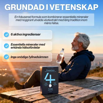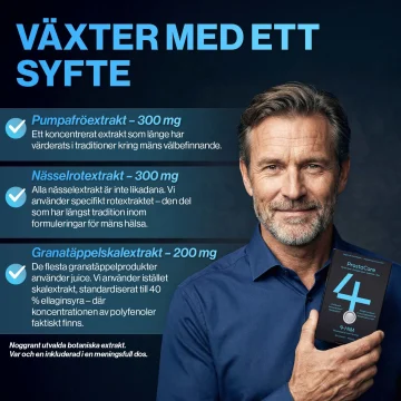 lngredienser: Pumpafröextrakt (Cucurbita pepo), brännässelextrakt (Urtica dioica L.), fyllnadsmedel (mikrokristallin cellulosa, dikalciumvätefosfat), granatäppelextrakt (Punica granatum), lykopen från tomat, zinksulfat, stabilisator (hydroxipropylmefylcellulosa), klumpförebyggande medel (magnesiumsalt av fettsyror, kiseldioxid), natriumselenit, ytbehandlingsmedel (hydroxipropylmetylcellulosa, polyetylenglykol, färgämne (kalciumkarbonat)). Näringsinnehåll (per dygnsdos): Zink 20 mg 200*; Selen 10 μg 200*; Granatäppelextrakt 200 mg **; Pumpafröextrakt 300 mg **; Brännässelextrakt 300 mg **; Lykopen 6 mg**. *% Av dagligt referensintag ** Dagligt referensintag ej fastställt