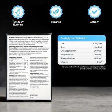 Rekommenderad daglig dos: 2 tabletter. Rekommenderad daglig dos bör inte överskridas. Kosttillskott ersätter inte en varierad kost. Det är viktigt med en mångsidig och balanserad kost samt hälsosam livsstil. När du använder medicin rekommenderar vi att du konsulterar en läkare, innan du använder kosttillskott. Förvaras torrt i rumstemperatur och borta från direkt solljus. Förvaras oåtkomligt för barn. Från 18 år.