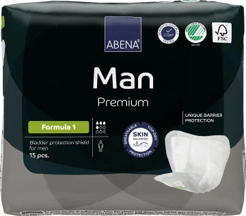 ABENA Man Formula 1 Premium är ett inkontinensskydd speciellt framtaget för män med lätt till måttlig inkontinens. Skyddet är T-format för att följa den manliga anatomin och ge en god passform inte begränsar rörelsefriheten. Bekvämt inkontinensskydd med mjukt ytskikt och en högeffektiv och snabbabsorberande Top Dry-kärna som ser till att huden förblir torr även efter flera läckage. Designade med ett unikt barriärsystem som ger extra säkerhet samtidigt som materialet andas. Med inbyggt odörsystem som minskar risken för oönskad lukt. Dermatologiskt testade, Svanen-märkta och FSC-certifierade. 15 st.