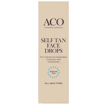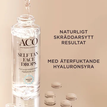 ACO Self Tan Face Drops är brun utan sol-droppar för ansiktet som blandas i ansiktskrämen och ger en jämn och solkysst lyster. Enkla att använda och håller i upp till 5 dagar. Berikad med hyaluronsyra och glycerin som återfuktar huden på djupet. Oparfymerad. Passar även känslig hud. Dermatologiskt testad. 30 ml.