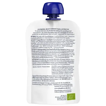 Banan* 31%, äpple* 22%, björnbär* 20%, blåbär* 10%, hallon* 10%, rapsolja* 4%, glutenfritt HAVREmjöl* 3%, vaniljstång* 0,04%. *KRAV-ekologiska ingredienser. KRAV-märkningen certifierad av SMAK. Deklaration: Energivärde 439 kJ/105 kcal, fett 4,7 g (varav mättat fett 0,3 g, enkelomättat fett 2,9 g, fleromättat fett 1,2 g), kolhydrater 15 g, varav sockerarter 11 g (endast naturligt förekommande), protein 1,1 g, salt <0,01 g (endast naturligt förekommande).