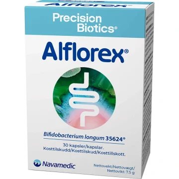 Alflorex är ett kosttillskott med mjölksyrabakterier. En kapsel innehåller 1 miljard bakterier. Alflorex innehåller den unika stammen Bifidobakterium longum 35624, som är studerad i över 75 vetenskapliga studier och är en unik stam på den svenska marknaden. Från 3 års ålder. En förpackning innehåller 30 kapslar.
