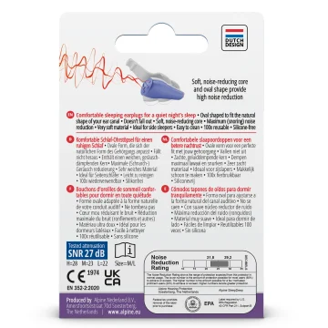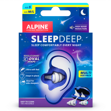 Alpine SleepDeep MultiSize Sleeping earplugs är bekväma öronproppar med en unik oval form som ger en perfekt passform och maximal ljuddämpning. Öronpropparna är speciellt designade för att förbättra nattsömnen och innehåller en ljudabsorberande gel som ger maximal dämpning mot omgivningsljud och snarkning. SleepDeep har en genomsnittlig dämpning(SNR) på 27 dB. Med sin unika ovala 3D-form passar de perfekt i hörselgången. Designen gör att öronpropparna sitter stadigt på plats oavsett sovställning. Materialet är mjukt och hudvänligt och öronpropparna är enkla att rengöra. Innehåller storlekarna SleepDeep Original och SleepDeep Mini. 2 par.