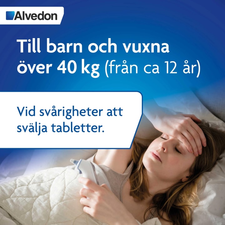 Alvedon munsönderfallande tablett 500 mg innehåller paracetamol som är smärtlindrande och febernedsättande. Den aktiva substansen och den smärtlindrande effekten upplevs efter cirka 30 minuter samt minskar feber i upp till 6-8 timmar. Alvedon kan användas mot värk och smärta av olika slag: t ex huvudvärk, tandvärk, menstruationssmärtor och muskelvärk. Alvedon är även febernedsättande, t.ex. vid förkylningar. Munsönderfallande tabletter är ett bra alternativ för personer som har svårt att svälja tabletter eller befinner sig på resa med begränsad tillgång till vatten. Tabletten löser sig på tungan efter några sekunder och inget vatten behövs. Smaken av tabletten är svartvinbär. Alvedon kan användas av personer med känslig mage och personer med ökad blödningsbenägenhet. Från 12 år. Läs alltid bipacksedeln noga före användning.