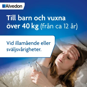 Alvedon 500 mg suppositorier innehåller paracetamol som är smärtlindrande och febernedsättande. Lämplig för personer över 40 kg (ca 12 år). Alvedon suppositorier är ett bra alternativ för dem som inte kan ta tabletter oralt vid t.ex. illamående och kräkningar eller vid svårigheter att svälja tabletter. För in suppositoriet med den trubbiga änden först för att undvika att den glider ut. Aktiva substansen börjar verka efter ca 30 minuter, lindrar feber upp till 6-8 timmar och smärta... Lindrar t.ex. feber, muskel- och ledvärk, huvudvärk, tandvärk, och mensvärk. Alvedon kan användas av personer med känslig mage och personer med ökad blödningsbenägenhet. Förpackningen är 100% återvinningsbar, så länge inga läkemedelsrester finns kvar i tablettkartan. Läs alltid bipacksedeln noga före användning.