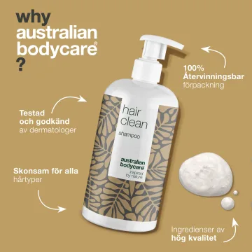 Australian Bodycare Hair Clean Shampoo är ett schampo som motverkar mjäll, anpassat för torr och kliande hårbotten. Innehåller tea tree oil med antiseptiska egenskaper, som hjälper till att motverka svamp och annan irritation i hårbotten. Med en mild återfuktande formula som lämnar håret mjukt, glansigt och lättskött. Passar torr och kliande hårbotten. Vegan. 500 ml.