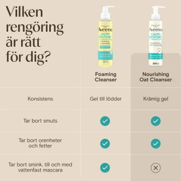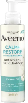 Aveeno CALM+RESTORE Nourishing Oat Cleanser är en skonsam ansiktsrengöring som tar bort smuts, orenheter och fett. Den innehåller prebiotisk havre som reparerar huden genom att återställa hudens fuktbarriär och feverfew som är känd för att lugna huden. Formulan är framtagen för att minimera risken för allergi och passar normal till torr och även känslig hud. Oparfymerad och dermatologiskt testad. 200 ml.