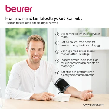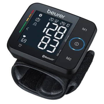 Beurer BC54 Blodtryck Handled med Bluetooth är en helautomatisk blodtrycksmätning för handled. Blodtrycksmätare som visar systoliskt och diastoliskt tryck samt puls. Visar även genomsnittliga blodtrycksvärden av samtliga sparade värden. Blodtrycksmätaren varnar vid eventuell oregelbunden hjärtrytm. Med tydlig och lättläst stor display, riskindikator automatisk avstängning, signal vid felmeddelande och batteriindikator. Inklusive förvaringsväska, manschett för handled och 2 x 1,5V AAA-batterier. 5 års garanti.