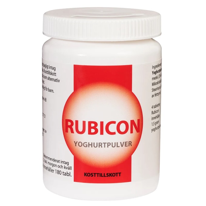 Rubicon är ett yoghurtpulver i tablettform, svensktillverkat koncentrerat kosttillskott med mjölksyrabakterier. Rubicon har ett högt innehåll av de två stora bakteriegrupperna Lactobacillus Bulgaricus och Streptococcus Thermophilus, som är vanligt förekommande i yoghurtkulturer. En dagsdos motsvarar 1,5 gram yoghurtpulver. Dosering: 4 tabletter per dag; 2 st på morgonen och 2 st på kvällen. 180 tabletter.