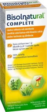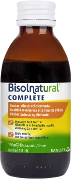 Bisolnatural Complete Hostsirap används för att lindra både rethosta och slemhosta som orsakats av inflammation i de övre luftvägarna. Bisolnatural Complete innehåller inga konserveringsmedel och består av naturliga ingredienser. Produkten hjälper till att göra slemmet mer tunnflytande vilket gör det lättare att hosta upp. Den skyddar även från irritation som kan orsaka hosta. Bisolnatural Complete passar bra när man är osäker på vilken typ av hosta det är man har. Den kan användas av vuxna och barn från 1 år. Produkten innehåller naturliga ingredienser och inga färgämnen har tillsatts. 133 ml.