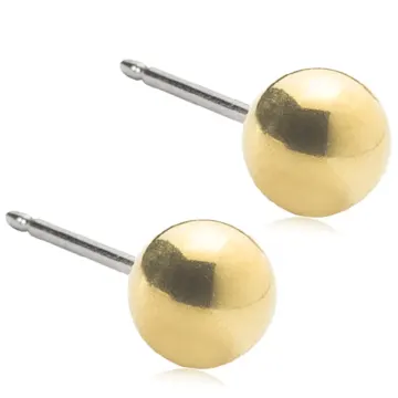 Blomdahl Örhängen Golden Ball är stilrena stiftörhängen i en klassisk design. Tillverkade i medicinsk titan som är allergivänligt och snällt mot huden, vilket gör att örhängena passar speciellt bra för dig med kontaktallergi eller känslig hud. Den guldglänsande ytbeläggningen kommer inte i kontakt med huden, men ger smycket en guldkänsla. Levereras i en hygieniskt försluten förpackning. Designade och tillverkade i Sverige. 5 mm.