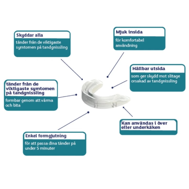 Bruxeeze Night Guard är en bettskena mot tandgnissling avsedd att användas när du sover. Individuellt anpassad bettskena med formbar värm och bett-teknologi, formas och anpassas för tänderna i över- eller underkäken, för bästa komfort. Med en hållbar utsida som ger skydd mot slitage orsakat av tandgnissling. 2 bettskenor per förpackning.