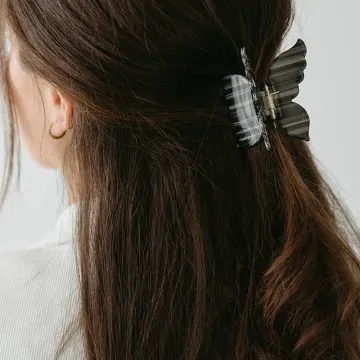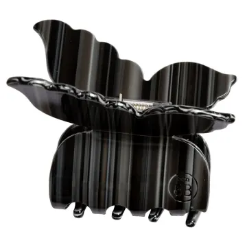 ByBarb Hårklämma Fjäril svart är en hårklämma formad som en fjäril. Beroende på hårets tjocklek fångar klämman upp hela ditt hår eller smyckar delar av håret i din uppsättning. Med en stark fjäder som fångar upp håret. Tillverkad av cellulosaacetat som är skonsamt för håret. Storlek: Vingspann: 6,8 cm x 7,2 cm.