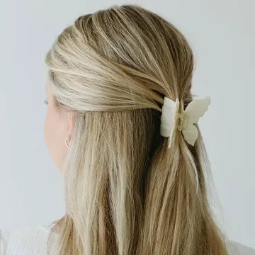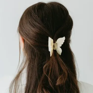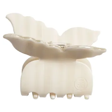 ByBarb Hårklämma Fjäril vit är en hårklämma formad som en fjäril. Beroende på hårets tjocklek fångar klämman upp hela ditt hår eller smyckar delar av håret i din uppsättning. Med en stark fjäder som fångar upp håret. Tillverkad av cellulosaacetat som är skonsamt för håret. Storlek: Vingspann: 6,8 cm x 7,2 cm.