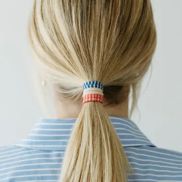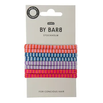 ByBarb Hårsnoddar multifärgad randig är ett set med randiga hårsnoddar. Designade med ränder i fyra olika färgkombinationer. Hårsnoddarna är lika snygga på handleden som i håret. Passar de flesta hårtyper. Snoddarna är tillverkade i Italien av återvunnen polyamid från återvunna däck (Blufibre). 8-pack.