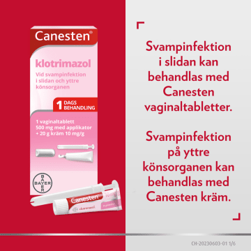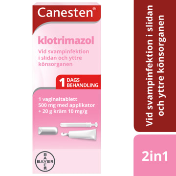 Behandla svamp i underlivet med Canesten kombi vaginaltablett+ kräm. Förpackningen innehåller engångsdos för vaginal behandling som hjälper dig att bli av med obehaglig underlivssvamp (en svamptillväxt främst orsakad av Candida albicans). Canesten innehåller en aktiv svampdödande ingrediens som behandlar svamp i underlivet och de 6 vanligaste symptomen. Om du har symptom på svamp i underlivet kan du känna dig lugn med att du inte är ensam. Kvinnor över hela världen drabbas av svampinfektion i underlivet ? det är mycket vanligt och inget du behöver oroa dig över. Men symptom såsom klåda, sveda, onormala flytningar, rodnad, svullnad och ömhet kan vara otroligt irriterande och göra ditt liv lite mer obekvämt. Canestens kombinationsförpackning för svamp i underlivet är en 2-i-1-behandling som hjälper dig att ta kontroll över din intimhälsa när du behöver det. Det sker i 2 enkla steg: först ska vaginaltabletten föras in, vilket sker med hjälp av införingshylsan eller med hjälp av ett finger. Därefter ska tabletten verka under natten och behandlar den inre infektionskällan till din underlivssvamp. Krämen skall användas 2?3 gånger om dagen i 1-2 veckor och behandlar samt lindrar klåda, ömhet och andra symptom, så att du kan njuta av dagen utan besvär. Från 15 år. Förstagångsinfektion ska alltid diagnostiseras av läkare innan behandling. Gravida och ammande ska rådgöra med läkare innan behandling. Kontakta läkare om symtom blir värre eller inte förbättras efter 7 dagar.