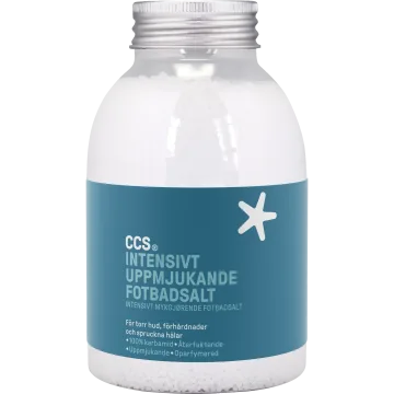 CCS Intensivt uppmjukande fotbadsalt innehåller enbart karbamid som mjukar upp torr och hård hud på fötterna. Karbamid är en fuktbindande ingrediens som både återfuktar och förbereder huden för fotvård. Saltet används i varmt vatten och hjälper till att göra huden smidigare inför filning eller behandling av förhårdnader. Oparfymerat. 310 g.