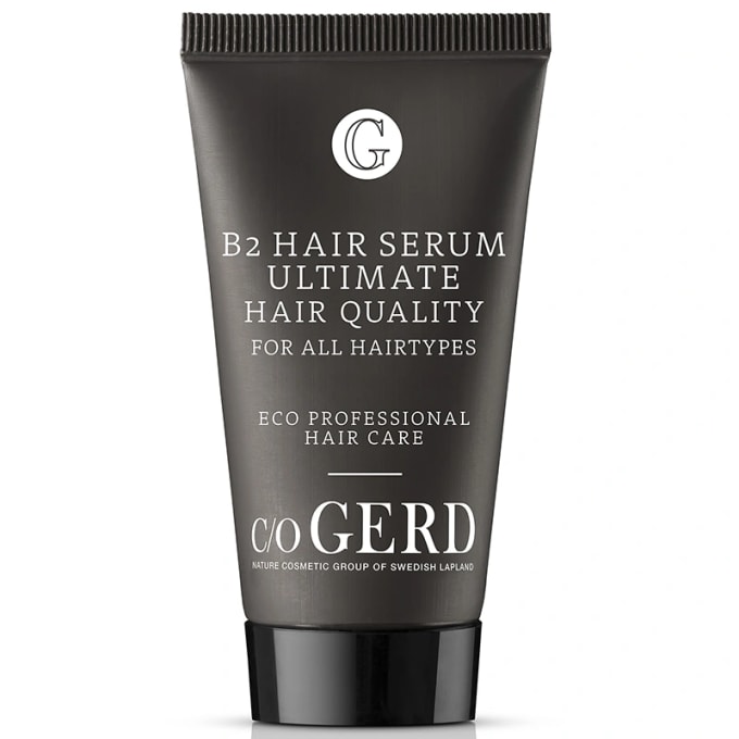 C/o Gerd B2 Hair Serum är ett ekologiskt serum för håret. Återfuktar och ger en vacker glans till håret med hjälp av blåbärsfröolja. Den lätta formuleringen gör att håret inte tyngs ned eller får en fet hinna. Innehåller även silkesprotein som hjälper till att motverka frissighet och gör att håret blir lätt att reda ut och borsta. Serumet appliceras i fuktigt eller torrt hår och ska inte sköljas ur. 30 ml.