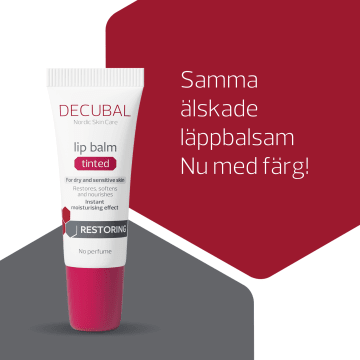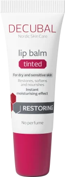 Decubal Restoring Lip Balm Tinted är ett vårdande och skyddande läppbalsam för torra och nariga läppar. Läppbalsamet har en naturlig rosa ton och innehåller bivax, ricinolja och E-vitamin som gör läpparna mjuka. Vattenfri, parfymfri och kliniskt bevisad att ge långvarig återfuktning i upp till 48 timmar. 10 ml.