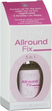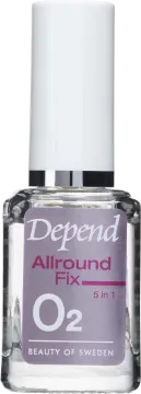 Depend 5 in 1 Allround Fix är en multifunktionell produkt med fem egenskaper i en. Den fungerar som baslack, topplack, snabbtorkare, stärkare och ger en högglansig yta. Formulan innehåller även UV-skydd och AHA-syra som hjälper till att återuppbygga och binda fukt i nageln. 11 ml.