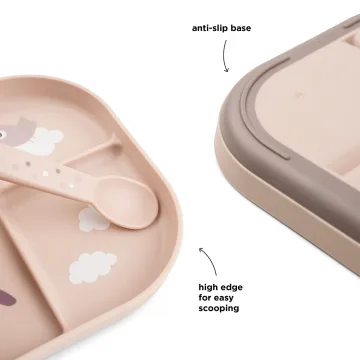 Done by deer Foodie Compartment Plate Happy clouds Powder är en tallrik med olika fack vilket gör det lättare för barnet att lära sig känna och förstå olika texturer och smaker. Den har en hög kant som gör det enklare för barnet att fylla på med mat och en anti-slip undersida som gör att tallriken sitter kvar på bordet.