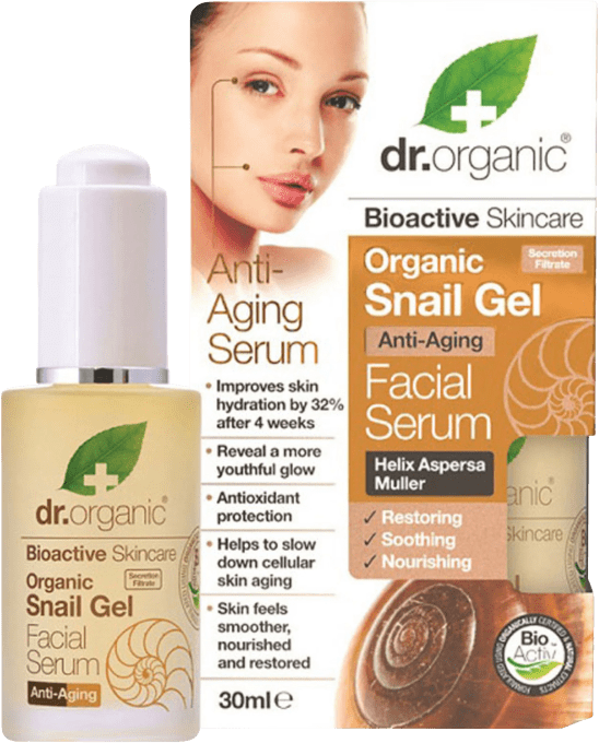 Dr. Organic Serum Snigelextrakt är ett åtefuktande och lugnande ansiktsserum som hjälper till att motverka ålderstecken. Berikat med Helix Aspersia Mulle, ett sekret som sniglar producerar för att reparera sin hud och sitt skal. Innehåller även ekologisk aloe vera, E-vitamin och glycerin som återfuktar huden och hjälper till att motverka ålderstecken. Snigelsekretet samlas utan att sniglarna skadas 30 ml.