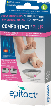 Epitact Comfortact Plus är ett fotskydd som hjälper till att tryckavlasta den främre trampdynan på fötterna och hjälper till att behandla liktornar och förhårdnader. Silikonet i skyddet är utvecklat av fotterapeuter och fungerar som ett substitut för den egna trampdynan. Dynan är mjuk och sprider ut trycket över hela trampdynan för att minska smärta när du går. CE-märkt medicinteknisk produkt. Säljes parvis. Storleksöversikt (skostorlek): Small: 36-38 Medium: 39-41 Large: 42-45