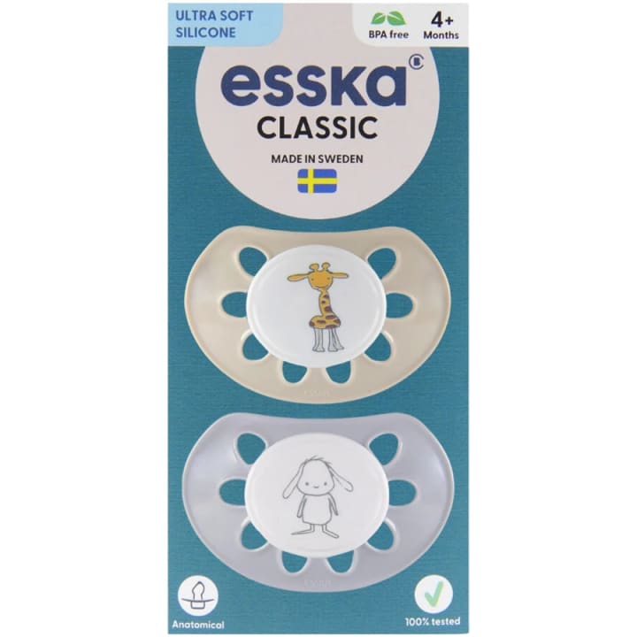 ESSKA Classic 4+m Silikon Beige är en napp med anatomiskt utformad sugdel. Sugdelen är gjord i mjuk, slitstark och högkvalitativ silikon. Nappen har en sköld med hålmönster för ökad luftgenomströmning som är snäll mot barns känsliga hud och minskad risk för hudirritation. Tillverkad i Sverige. 2-pack.