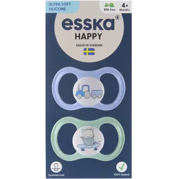 ESSKA Happy 4+m Silikon Blå är en napp med symmetrisk sugdel. Nappen är alltid rättvänd och har en ventilerad sköld som är snäll mot barns känsliga hud. Sugdelen är gjord i mjuk, slitstark och högkvalitativ silikon. Tillverkad i Sverige. 2-pack.