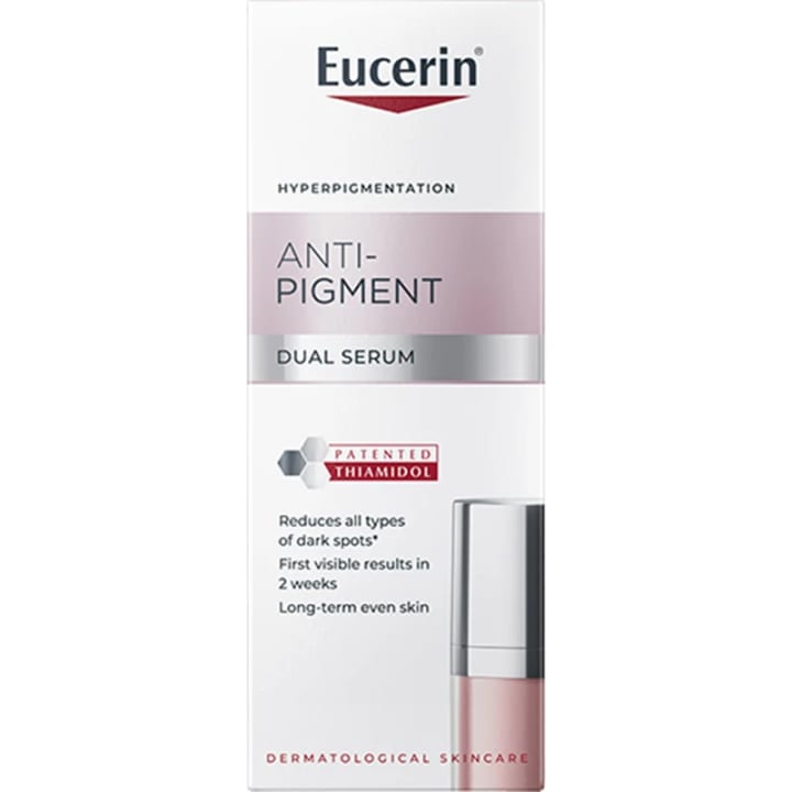 Eucerin Anti-Pigment Dual Serum är ett ansiktsserum med anti age-egenskaper, som kan bidra till att motverka åldersrelaterad pigmentering hos huden. Innehåller bland annat hyaluronsyra och thiamidol. Bidrar till att minska mängden melanin i huden vilket i sin tur minskar uppkomsten av pigmentfläckar. Lämnar huden mjuk och återfuktad, med en vacker lyster. Passar alla hudtyper. 30 ml.