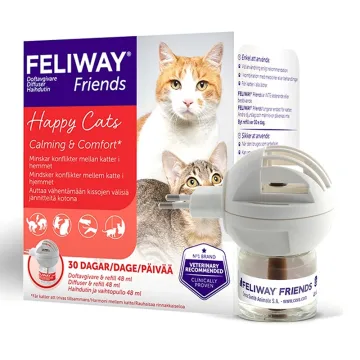 Feliway Friends Doftavgivare sprider en syntetisk doftkopia av katters naturliga ”harmoniferomoner”. Dessa feromoner hjälper katter att trivas tillsammans, perfekt för hem med fler än en katt. Katterna trivs bättre med varandra och du slipper problem som att de slåss eller fryser ut varandra. Doftspridaren ansluts till ett eluttag inomhus. En doftavgivare sprider doft över en yta av ca 70 m². Följ instruktionerna noga. Feliway Friends har dokumenterad effekt och rekommenderas av veterinärer. Doftavgivare + lösning 48 ml.