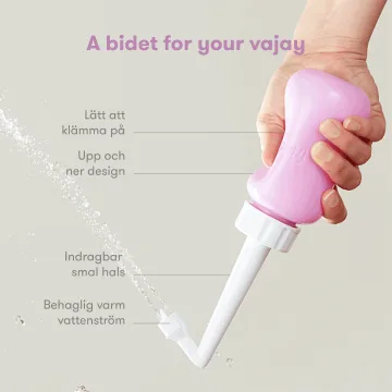 Fyll flaskan med ljummet vatten. Skruva på korken ordentligt och dra ut munstycket. Sätt dig på toaletten, vänd flaskan upp och ner och vinkla munstycket mot underlivet. Kläm varsamt på flaskan så många gånger du behöver. Töm flaskan, låt den torka och tryck ihop munstycket för förvaring.