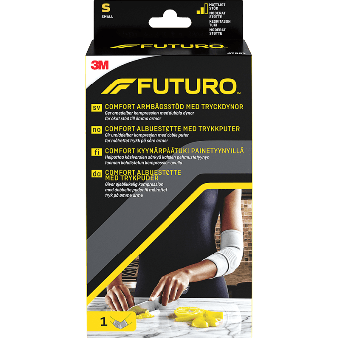 Futuro armbågsstöd är ett smärtstillande armbågsstöd som används vid lindriga ledbesvär i armbåge till följd av förslitning eller överansträngning. Masserande effekt som påskyndar läkningsprocessen. Passar både vänster och höger armbåge. Justerbart band. Finns i storlek small, medium och large. Storleksöversikt: Storlek S (omkrets under armbåge 23,0-25,5 cm) Storlek M (omkrets under armbåge 25,5-28,0 cm) Storlek L (omkrets under armbåge 28,0-30,5 cm)