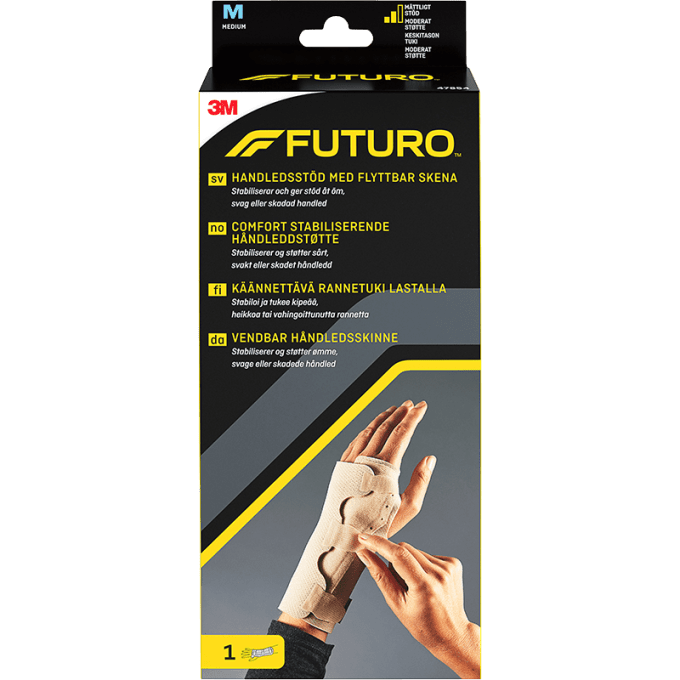 Futuro handledsstöd har en formbar skena som ger stöd och avlastning åt skadade, svaga och överansträngda leder. Förebygger även nya skador. Justerbara fästen för individuell anpassning. Passar både höger och vänster handled. Finns i storlek small, medium och large. Handtvätt. Storleksöversikt: Storlek S (handledsomkrets 12,7-15,9 cm). Storlek M (handledsomkrets 15,9-19 cm). Storlek L (handledsomkrets 19-22,9 cm).
