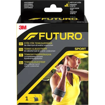 Futuro Stöd För Tennisarmbåge Armbågsrem används för att minska smärta i underarmen. Armbågsstödet avlastar muskler och senor i armen. Den kan användas vid tennisarmbåge eller golfarmbåge. En kompressionskudde gör stödet mujkt och avlastande. Storleken kan justeras med spännet. Armbågsstödet kan användas på både höger och vänster arm. Storlek: One size.
