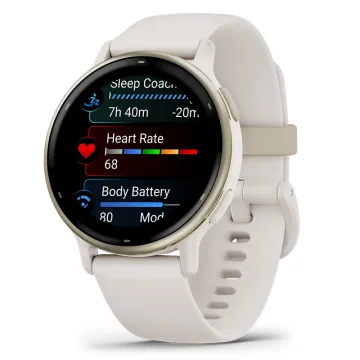 Garmin Vivoactive 5 Ivory/Cream Gold är en smartwatch med avancerade hälso- och träningsfunktioner. Den registrerar steg, distans, förbrända kalorier, sömn, stress och andning och är fullspäckad med funktioner såsom Body Battery, Kvinnors Hälsa, Sömncoach, VO2 MAX, Garmin Pay och musikappar. Den har också utrustats med rullstolsläge för rullstolsanvändare. Garmin Vivoactive 5 är mer än bara en smartwatch, det är en personlig tränare på handleden som hjälper dig att nå dina mål. Håller upp till 11 dagar i smartwatchläge, och upp till 17 timmar i GPS-läge. Passar handleder med en omkrets på 125-190 mm.
