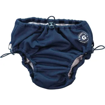 Geggamoja UV Badblöja Marinblå är ett par badbyxor för små barn. Badblöjan är försedd med justerbar resår med dragsko i midjan och i benöppning för att se till att den sitter bekvämt och säkert. Babybyxan har UV50+ som blockerar 98% av solens UVA- och UVB-strålar. Det behövs ingen extra blöja eller inlägg under badblöjan då den håller tätt även när den är blöt. Perfekt till babysim.