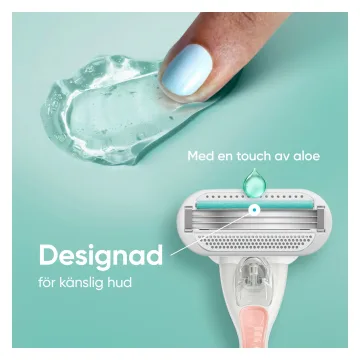 Gillette Venus Smooth Sensitive Rakblad är utformade för kvinnor med känslig hud. Dessa rakbladsrefiller har tre konturanpassade blad för en snabb och effektiv rakning utan irritation. Med SkinCushion-smörjremsa som SkinElixir med aloe vera som hjälper till att skydda huden mot irritation som kan uppstå i samband med rakning. Rakbladen passar samtliga Venus-handtag. 4-pack.