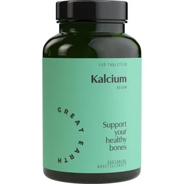 Great Earth Kalcium är ett kosttillskott med kalcium. Kosttillskottet innehåller sju olika former av kalcium och är utformad med Great Earths mineraltransportsystem Portamins. Portamins består av lättlösliga och lättupptagliga mineralformer som citrat, glukonat, askorbat, malat, succinat och aminosyrakelat. Aminosyrorna hjälper till att transportera mineralerna in i cellerna. Kalcium är viktigt för bland annat benstomme och tänder. Kalcium bidrar även till normal muskelfunktion, energiomsättning samt till matsmältningsenzymernas normala funktion. Förutom kalcium innehåller kosttillskottet även D-vitamin och K-vitamin. D-vitamin bidrar till normalt upptag och utnyttjande av kalcium. K-vitamin bidrar till att bibehålla normal benstomme. Innehåller även gurkmeja och svartpepparextraktet Bioperine. Vegansk. 120 tabletter.