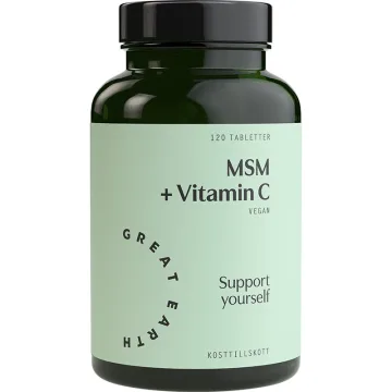 Great Earth MSM+Vitamin C är ett kosttillskott med MSM och vitamin C. MSM är organiskt svavel och står för Metylsulfonylmetan. Svavel finns i det mesta vi äter men det förstörs vid bearbetning, uppvärmning och förvaring av maten. Kosttillskottet innehåller även vitamin C som kan bidra till immunsystemets normala funktion. Rekommenderat intag: tre tabletter dagligen, utspritt över dagen i samband med måltid. Ger 3000 mg MSM per dagsdos. 120 tabletter per förpackning.