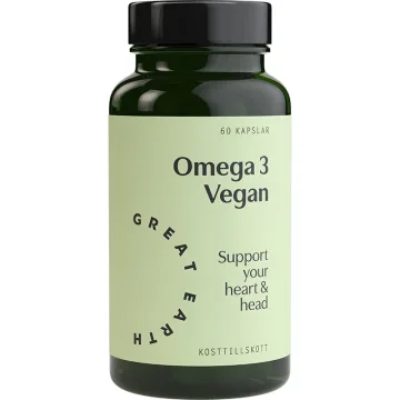 Great Earth Omega 3 Vegan är ett kosttillskott med vegetabilisk omega 3 från mikroalgen Schizochytrium. Rikt på omega 3-fettsyrorna EPA och DHA, bra för dig som är vegan eller sällan äter fisk. Alger är en hållbar källa till omega 3 som inte påverkar haven. Algerna odlas på land i en ren och kontrollerad miljö, vilket gör att produkten är fri från tungmetaller och andra föroreningar. Veganskt kosttillskott. 60 kapslar per förpackning.