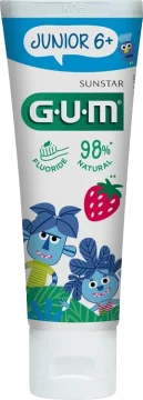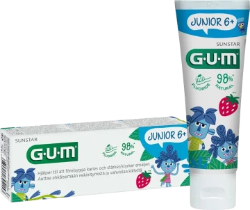 GUM Junior Tandkräm är anpassad för barn över sex år, med 98% naturliga ingredienser och har en god smak av jordgubb. Berikad med en patenterad kombination av fluor och isomalt. Barntandkräm med mild formula som är skonsam mot barnens tandkött och första permanenta tänder. Innehåller 1450 ppm fluor. Passar barn från 6 år. 50 ml.