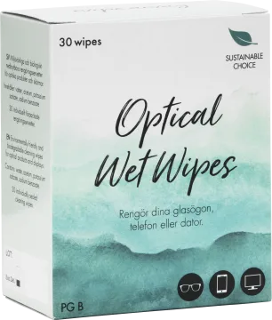Haga Eyewear Optical WetWipes är rengöringswipes för glasögon eller skärmar på till exempel telefon eller dator. Servetterna är styckförpackade så att du enkelt kan ta med en servett i väskan. Dessa wipes är tillverkade i ett miljövänligt biologiskt nedbrytbart material. 30 st.