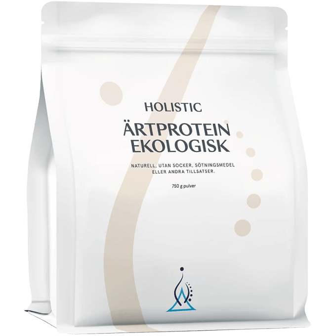 Holistic Ärtprotein Ekologisk är ett naturellt vegetabiliskt proteinpulver gjord på ärtprotein utan socker eller sötningsmedel. Ärtproteinpulvret är ett proteinkoncentrat från gula ärtor med mild smak, komplett aminosyraprofil och har hög proteinhalt. Protein bidrar till att öka muskelmassa, samt bibehålla muskelmassa och normal benstomme. Blandas med vätska som proteindrink eller i smoothies men kan också användas i matlagning och bakning. Passar även dig som är känslig mot mjölkprodukter, soja eller gluten. Tillverkat av GMO-fri och ekologisk råvara. 750 g.