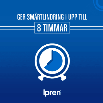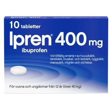 Ipren 400 mg tablett börjar verka inom 30 minuter och ger långvarig lindring i upp till 8 timmar. Ipren används vid tillfälliga lätta till måttliga smärttillstånd, till exempel huvudvärk, tandvärk, ryggbesvär, muskel- och ledvärk, menstruationssmärtor, migrän samt feber vid förkylningssjukdomar. Ipren har antiinflammatoriska egenskaper och kan användas av vuxna och barn från 12 år.
