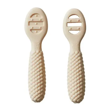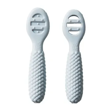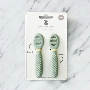 Jack o Juno Bubble Pre-Spoon är skedar utformade för att underlätta barnets övergång till att äta själv. Innehåller två skedar som används stegvis där sked för steg 1 har en solid yta som passar för släta puréer. När barnet är redo för mat med tjockare konsistenser används steg 2 som har öppna slitsar för att skopa upp mat som exempelvis gröt. Båda skedarna är utformade med prickar på sidorna som kan ge lindring för ett kliande tandkött. Den bubbliga designen på handtagen för det enkelt för små händer att greppa. Tillverkade i livsmedelsgodkänd silikon. Passar för barn från fyra månaders ålder.