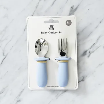 Jack o Juno Klassiskt Bestickset För Baby är ett bestickset med gaffel och sked. Besticken är framtagna med handtag i livmedelsgodkänd silikon och rostfritt stål. Kan diskas i diskmaskin och för hand. Passar att användas av barn från fyra månaders ålder.