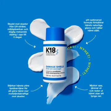 K18 Damage Shield Conditioner är ett avancerat balsam som vårdar på djupet, skyddar håret mot yttre påfrestningar, och hjälper till att bevara hårets och hårbottens naturliga pH-värde. Balsamet är berikat med K18Peptide, en patenterad bioaktiv peptid som hjälper till att stärka håret och öka dess motståndskraft vid dagligt slitage. Balsamet hjälper även till att sluta hårets fjällskikt samtidigt som det jämnar ut och förseglar ytliga skador. Efter användning känns håret mjukt, glansigt och lätt. Passar alla hårtyper.
