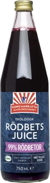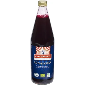 Kung Markatta Rödbetsjuice Krav är ekologisk rödbetsljus som kan drickas naturell precis som den är. Pressas på ekologiska rödbetor direkt efter skörd, juicen tillsätts sen med mjölksyrejäst för att få en fin balans mellan sötma och syra. 750 ml.